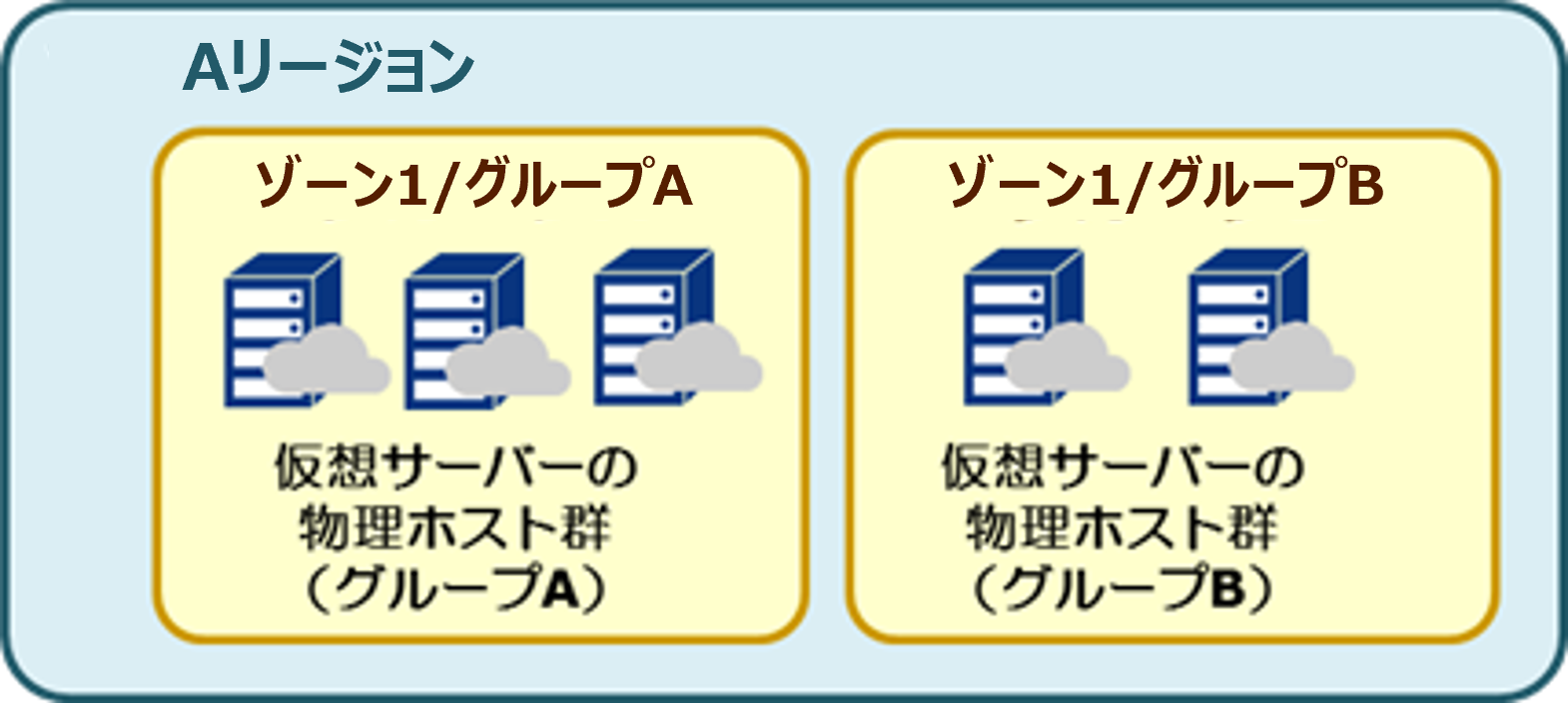 - 本サービスでは基本、1リージョンに 2つ以上のゾーン/グループを提供しており、ゾーン内で冗長構成を組む際には、異なるゾーン/グループで構成いただくことを推奨します。※単一のゾーン/グループ内で冗長構成を組むと、同一設備 (スイッチ、物理ホスト、ストレージ) に収容される可能性があるため。