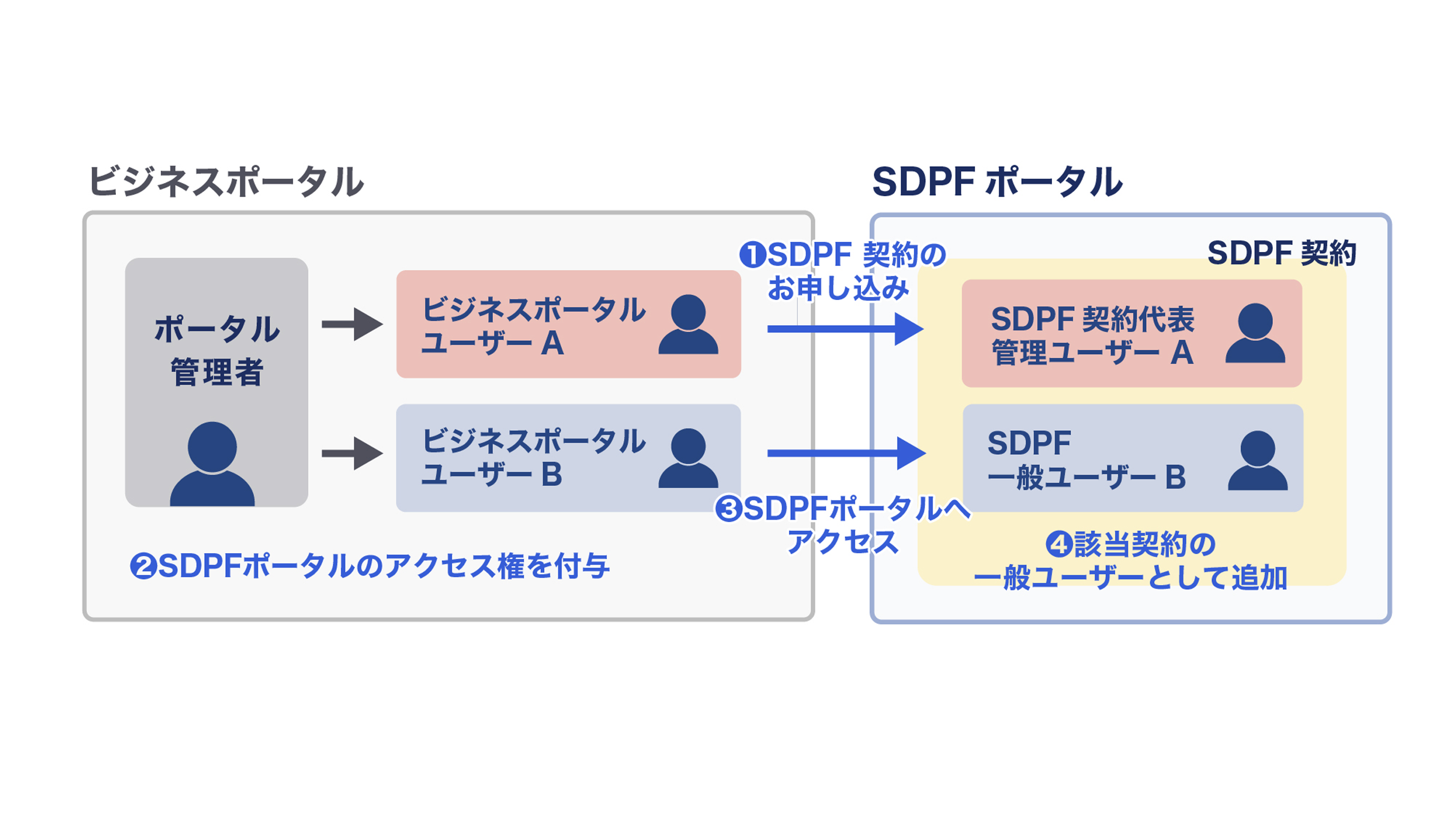 すでにすべてのSDPF契約に対するアクセス権を有するビジネスポータルユーザーは、SDPF契約が完了したタイミングで該当の契約のユーザーとして追加されます。それ以後に当該契約にアクセス権を付与されたビジネスポータルユーザーは、最初に当該契約にアクセスしたタイミングかビジネスポータルとSDPFポータルとのシステム同期のタイミング(通常1日に1回)で、当該契約のユーザーとして追加されます。