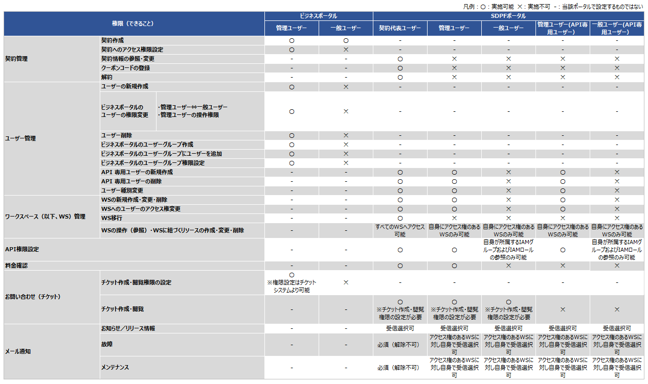 ビジネスポータルでSDPF契約へのアクセス権限削除やユーザーの一時停止を行う際は、以下のようにSDPFユーザーが削除されるためご注意ください。