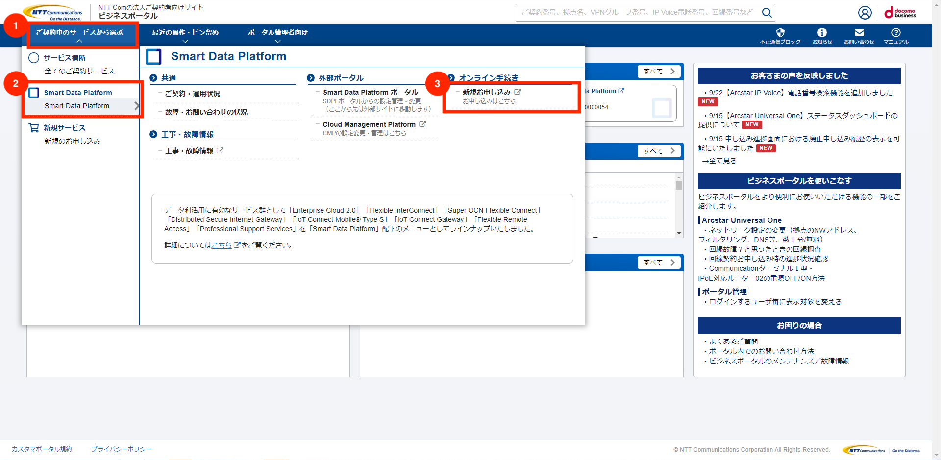 Smart Data Platform は、ビジネスポータルからお申し込みいただけます。ビジネスポータルの操作方法・仕様については、こちら をご確認ください。 ビジネスポータルをご利用中ではないお客さまは、こちら をご確認ください。