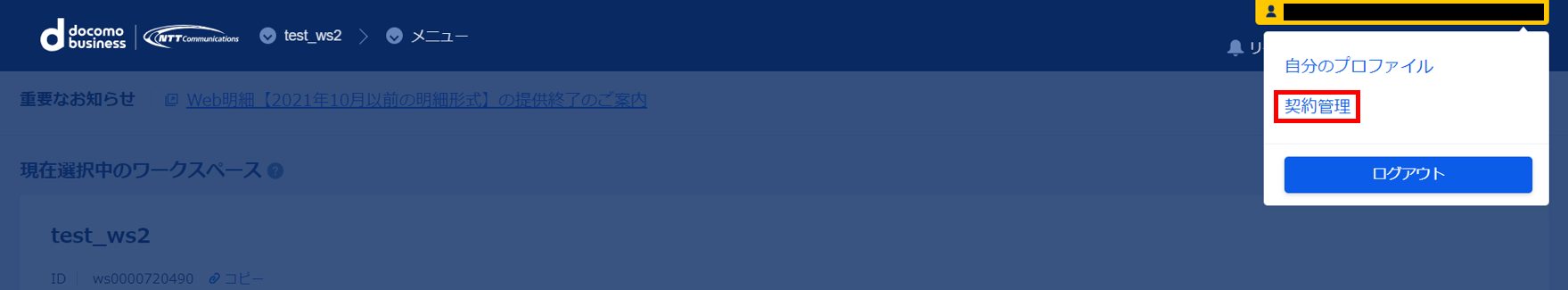 Smart Data Platformポータル(以下SDPFポータル)に ログイン し、ヘッダーのユーザーの名前のタブから[契約管理]をクリックします。