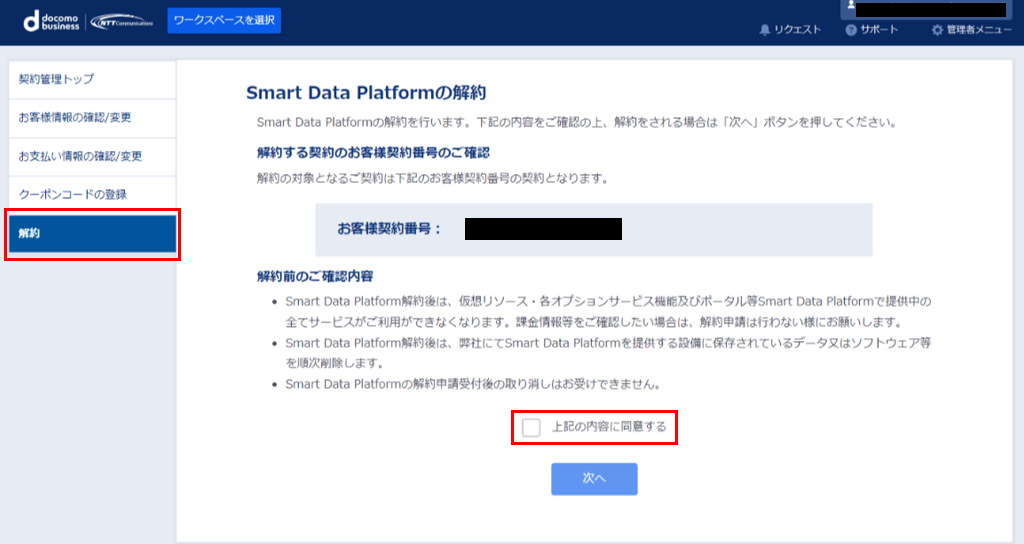左側メニューの[解約]をクリックし、内容に問題がなければ[上記の内容に同意する]にチェックを入れ、[次へ]をクリックします。