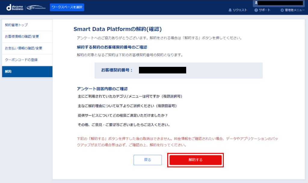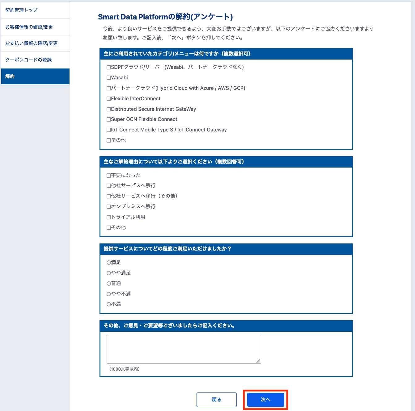 「Smart Data Platformの解約(アンケート)」の内容をご記入の上[次へ]をクリックします。