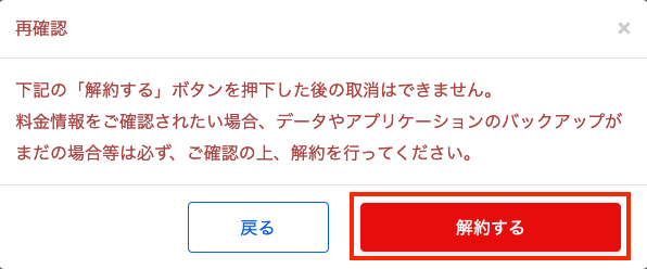 一度解約すると該当のリソースなどはすべて削除され、サービスのご利用ができなくなります。解約申請受付後の取り消しはお受けできませんのでご注意ください。