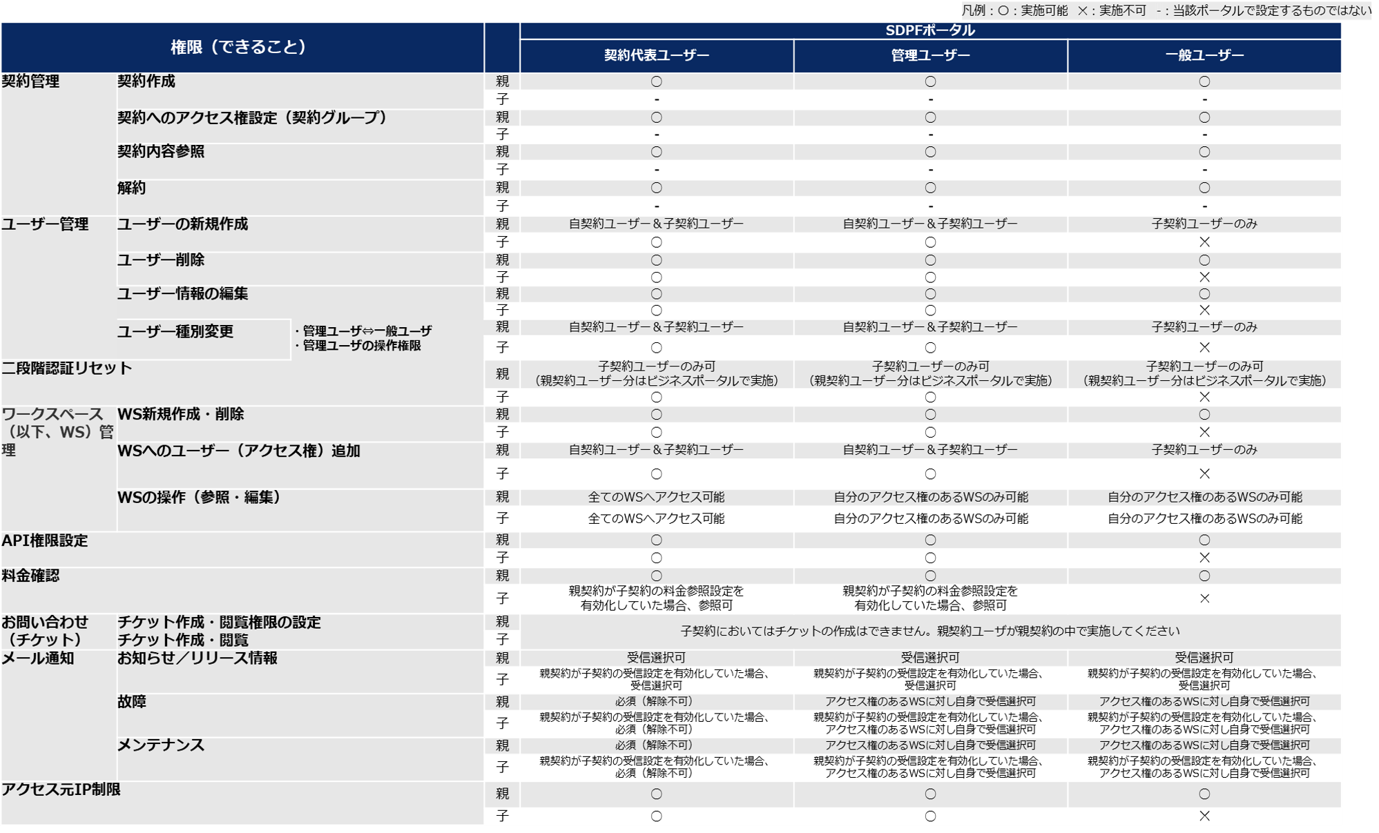 (7)子契約管理における親契約ユーザーおよび子契約ユーザーの各種権限¶