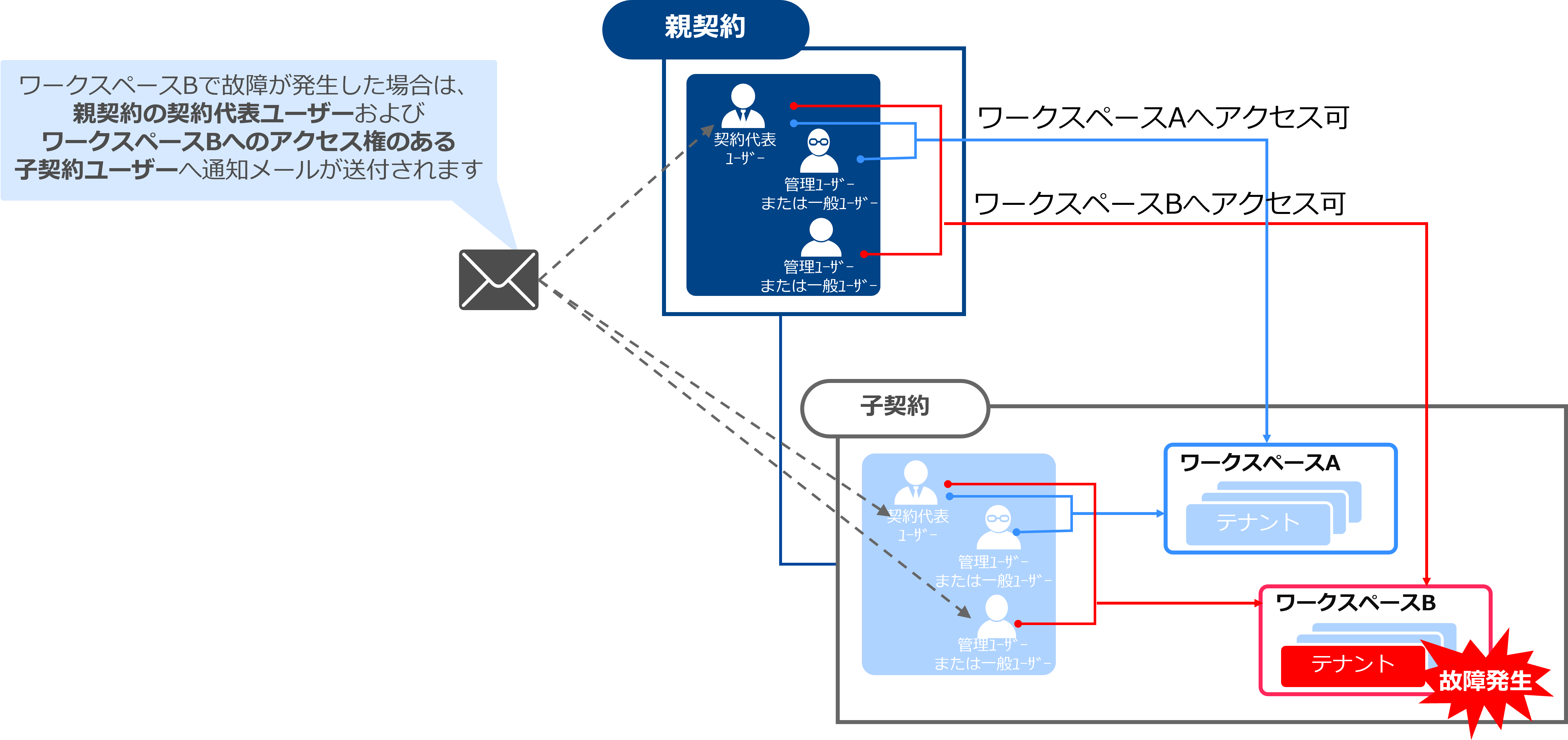 ・対象のワークスペースにアクセス権のある親契約の管理ユーザー/一般ユーザー(各ユーザー自身で受信選択可)