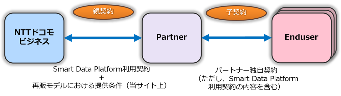 再販モデルでは、Smart Data Platformの利用契約は、ドコモビジネスとパートナーとの間に発生し、パートナーとエンドユーザーとの間では、パートナーによる独自の契約を締結いただくことになります。