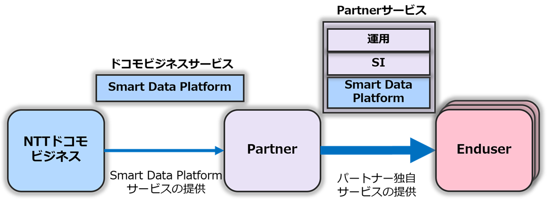 パートナーはドコモビジネスからSmart Data Platformサービスを仕入れ、パートナー独自のシステム開発やアプリケーション提供、運用・監視といったマネージメントサービスなどの付加価値を加え、新たなサービス/ソリューションとして組み上げた上で、それをエンドユーザーへ再販できます。