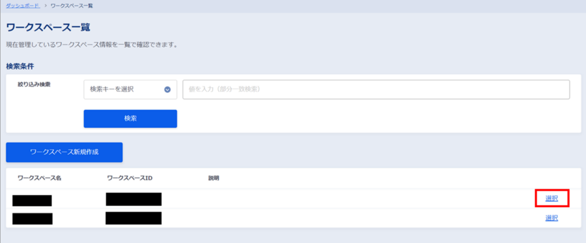 ダッシュボードの[ワークスペースを選択]ボタンをクリックします。