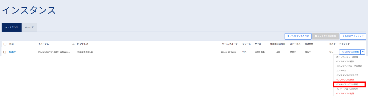 左ペインのメニューから「サーバーインスタンス」→「インスタンス」をクリックし、対象となるサーバーを選択、プルダウンのメニューから「インタフェースの接続」をクリックします。