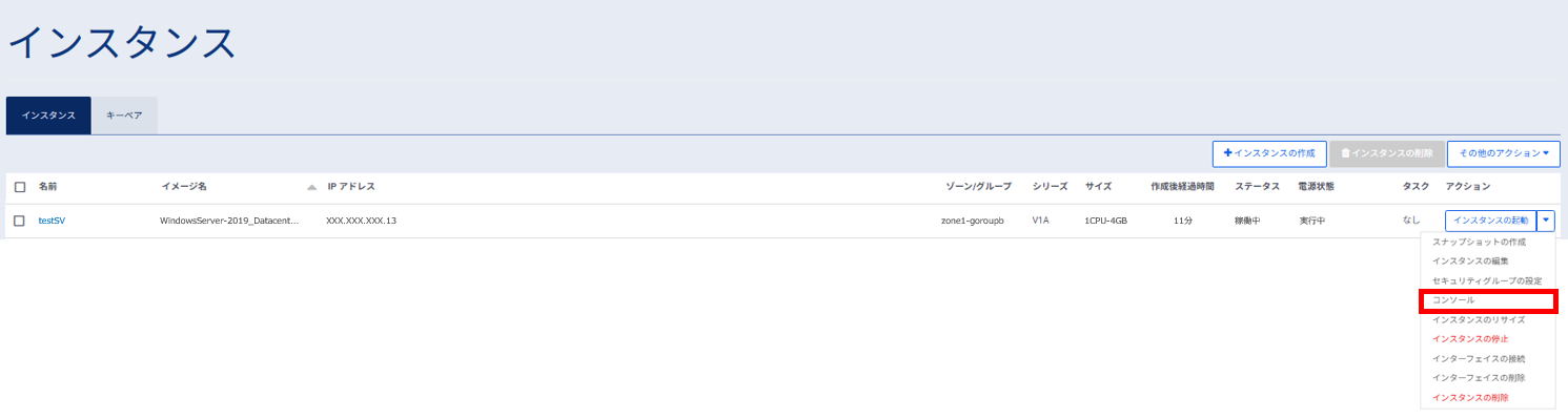 左ペインのメニューから「サーバーインスタンス」→「インスタンス」をクリックし、対象となるサーバーを選択、プルダウンのメニューから「コンソール」を選択します。