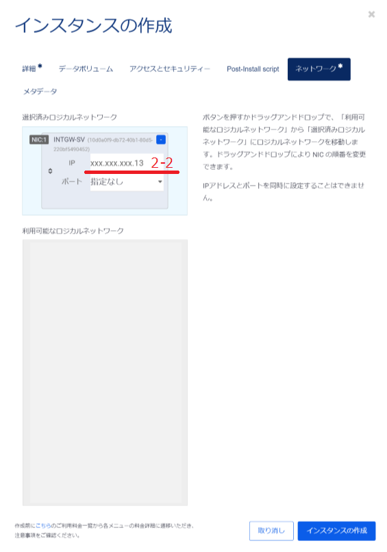 「利用可能なロジカルネットワーク」に表示されているロジカルネットワークの中からこのインスタンスが接続するものを選択し、ドラックアンドドロップで「選択済みロジカルネットワーク」に移動させます。
