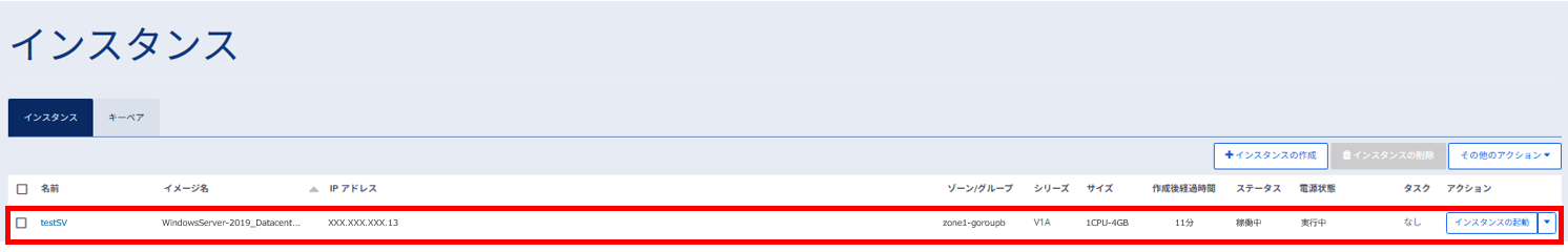 インスタンスの作成が完了すると、一覧画面に作成されたインスタンスがリストに追加されて表示されます。