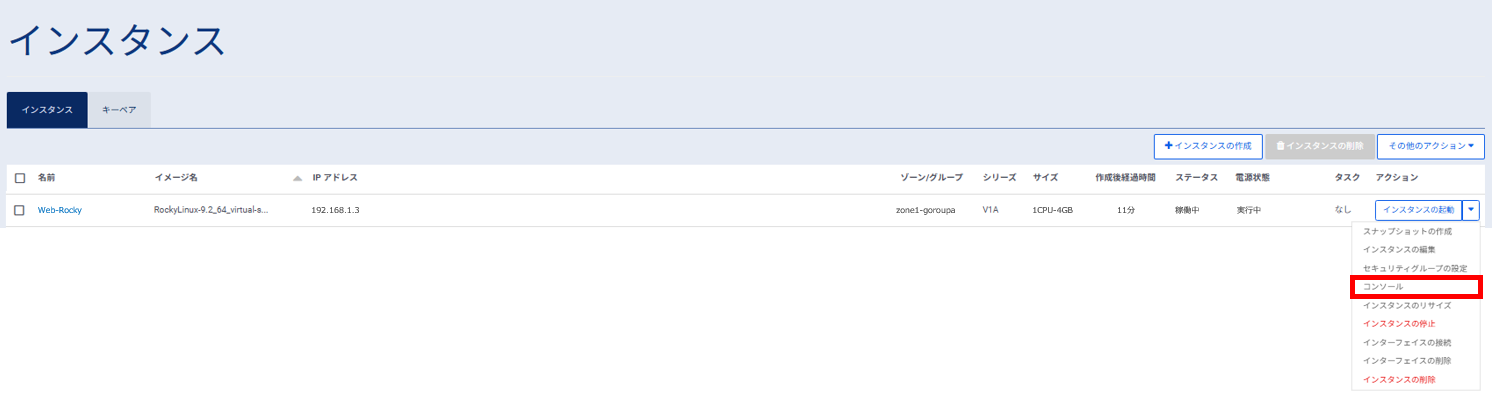 左ペインのメニューから「サーバーインスタンス」→「インスタンス」をクリックし、対象となるサーバー(Web-Rocky)を選択、プルダウンのメニューから「コンソール」を選択します。