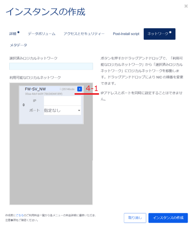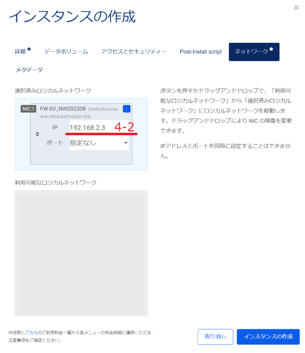 「利用可能なロジカルネットワーク」に表示されているロジカルネットワークの中からこのインスタンスが接続するものを選択し、ドラックアンドドロップで「選択済みロジカルネットワーク」に移動させます。