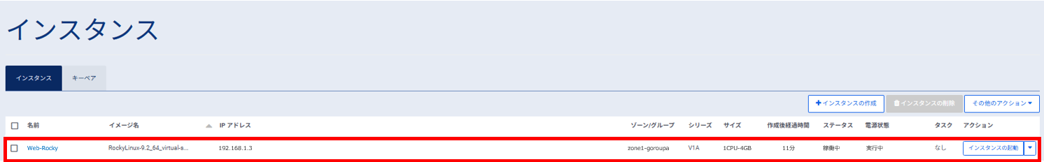 インスタンスの作成が完了すると、一覧画面に作成されたインスタンスがリストに追加されて表示されます。