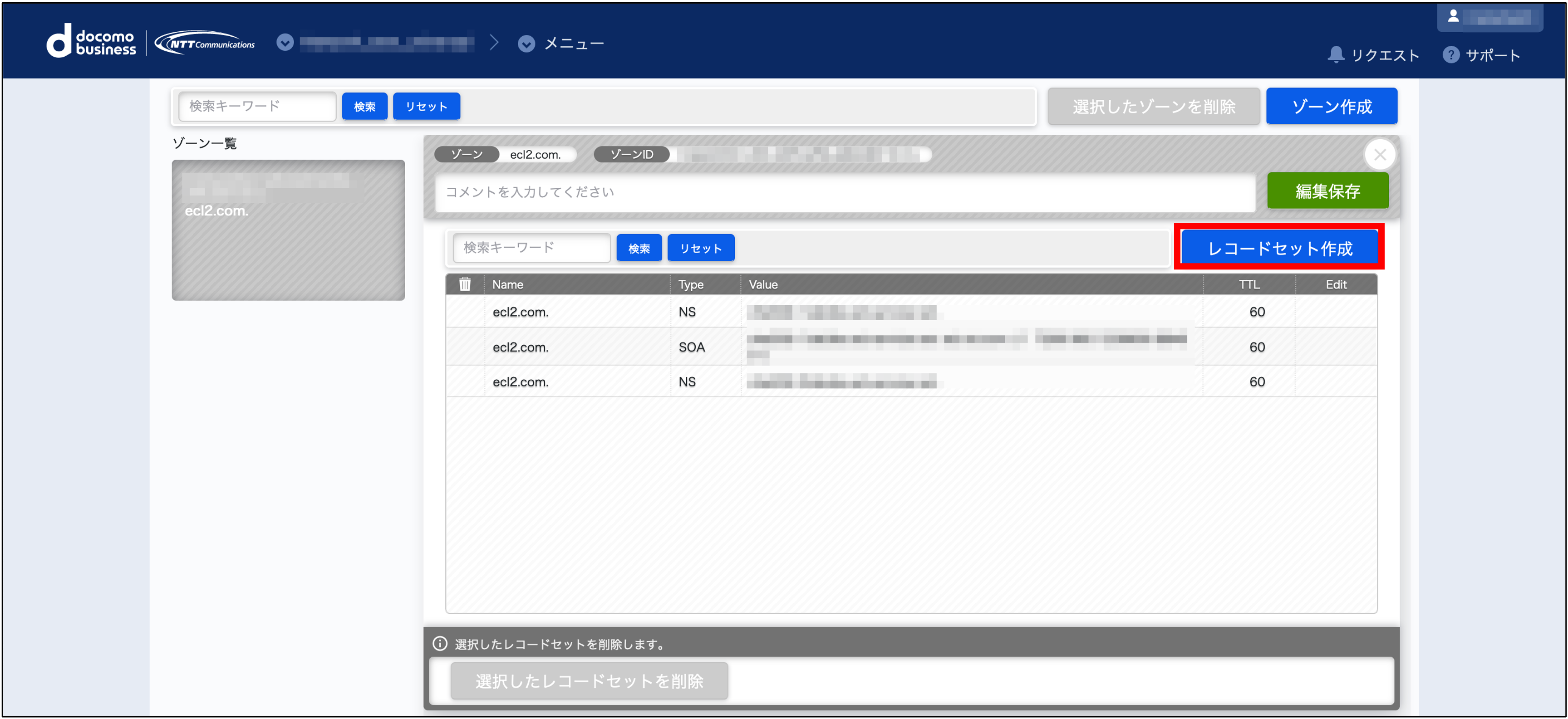ドメイン名「ecl2.com.」というホストゾーンが作成されます。
