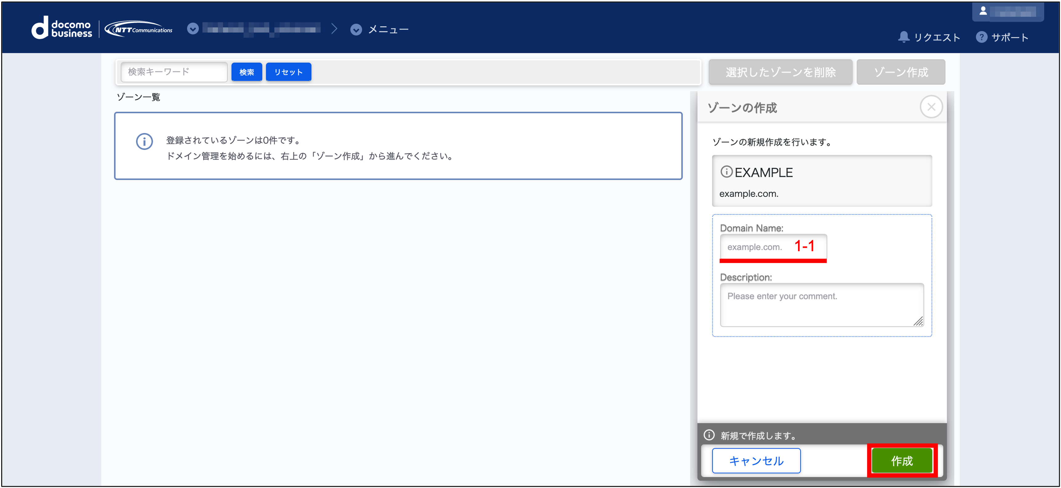 DNSコンソール上部の「ゾーン作成」をクリックします。