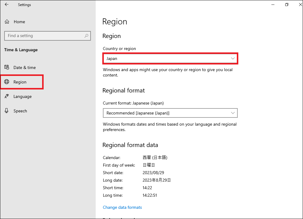 左ペインから[Region]を選択し、[Country or region]プルダウンメニューから[Japan]を選択します。