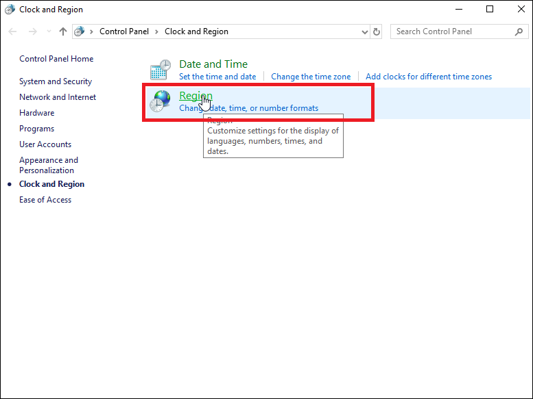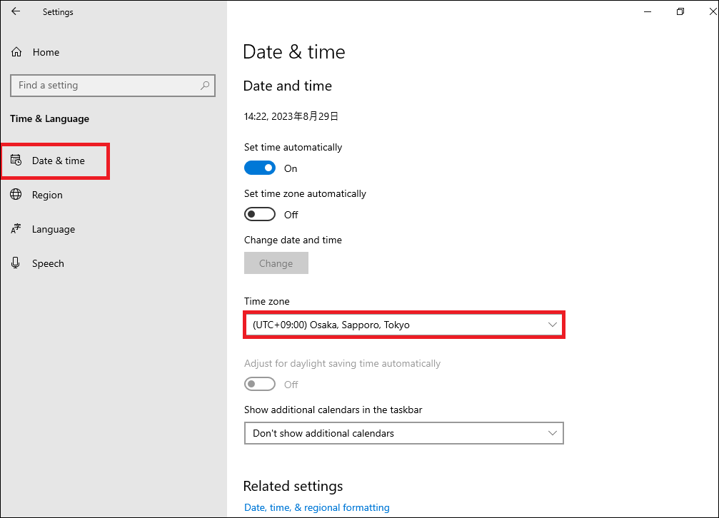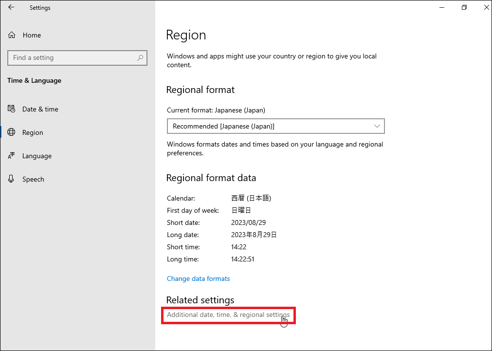 [Region]画面を下にスクロールし、[Related settings]の下にある[Additional date,time,& regional settings]をクリックします。
