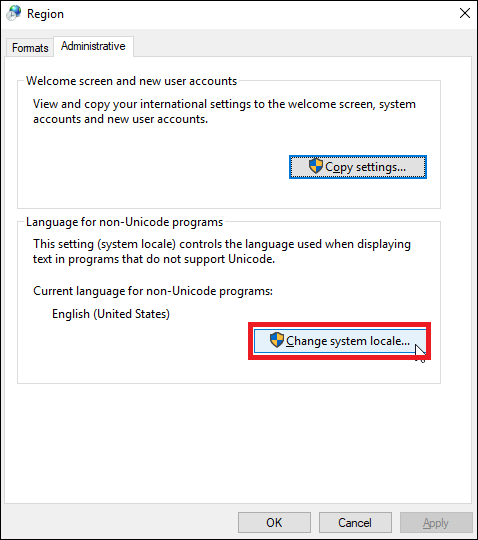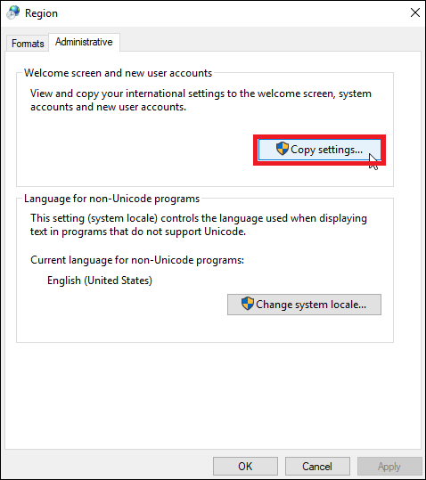 [Region]画面の[Administrative]タブを開き、[Copy setttings]をクリックします。