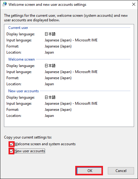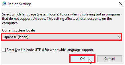 [Region Settings]画面で、[Current system locale]プルダウンメニューから[Japanese]を選択し、[OK]をクリックします。