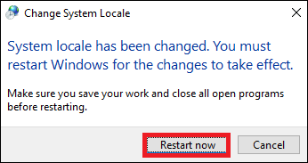 再起動を要求するダイアログ ボックスが表示されたら、[Restart now]をクリックしてシステムを再起動します。