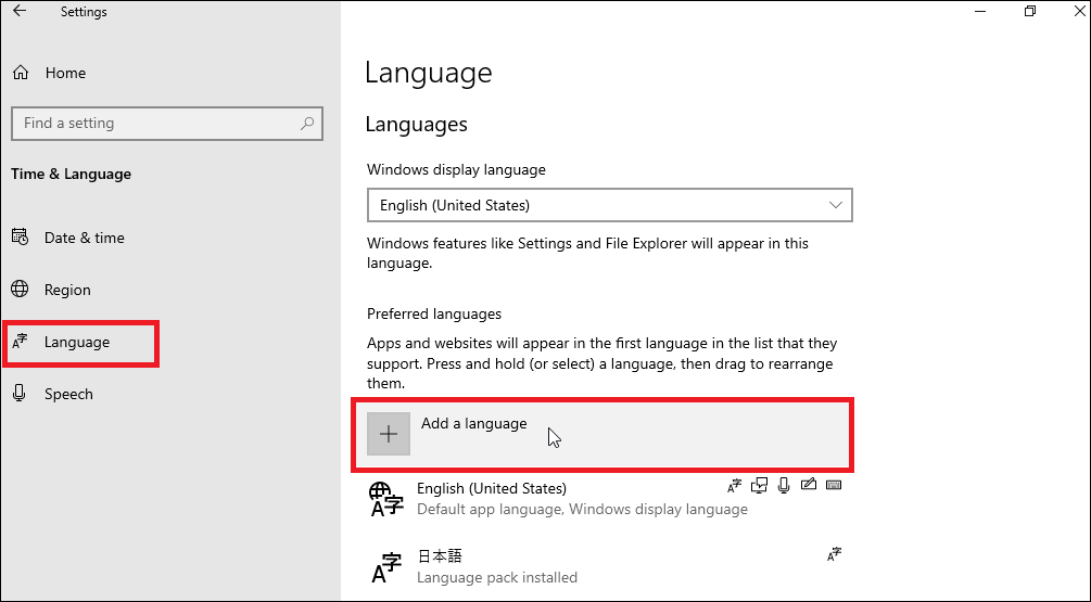 左ペインで[Language]を選択し、右側の画面の[Add a language]をクリックします。