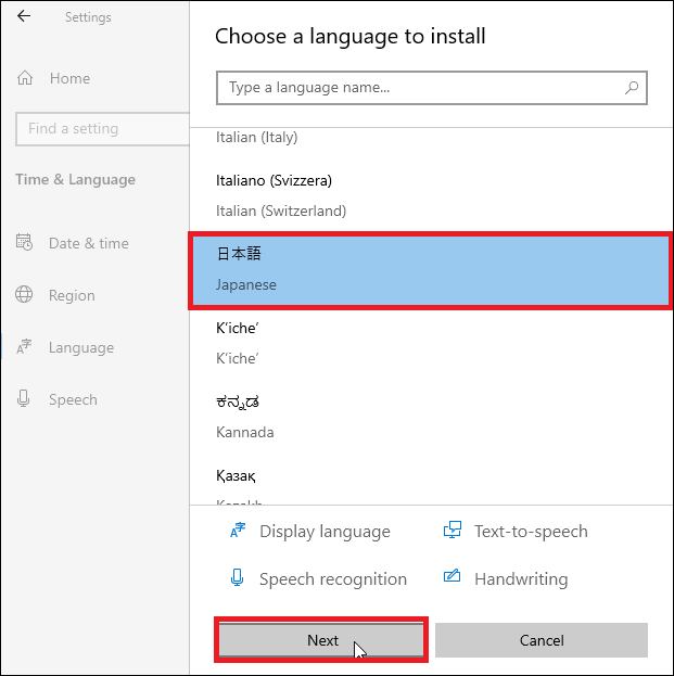 [Choose a language to install]画面で、リストから日本語を選択し、[Next]をクリックします。