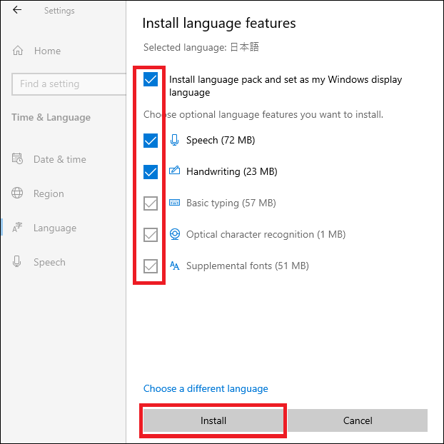 [Install language features]画面ですべての項目が選択されているかどうかを確認し、[Install]をクリックします。