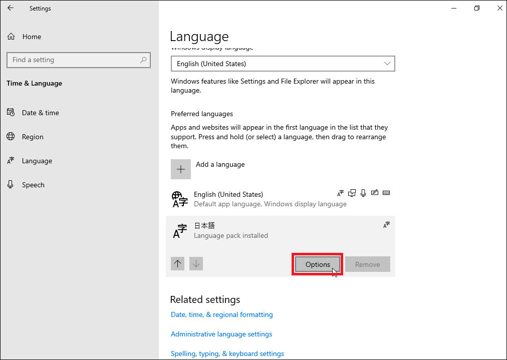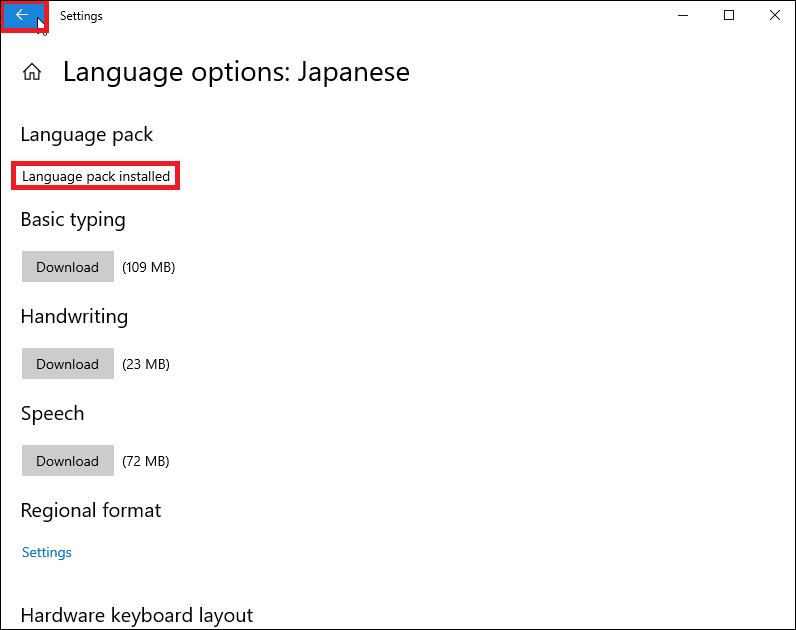 [Language options]画面で、[Language pack installed]と表示されているかどうかを確認し、左上部にある左矢印アイコンをクリックします。