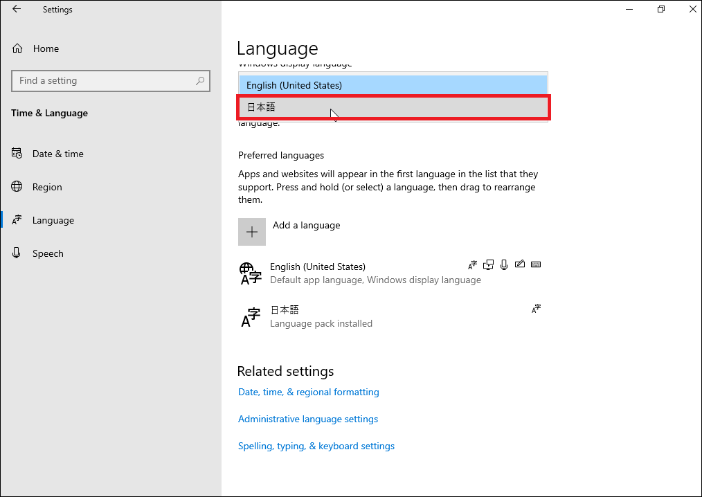 [Language]画面で、Windowsの表示言語のプルダウンメニューから日本語を選択します。