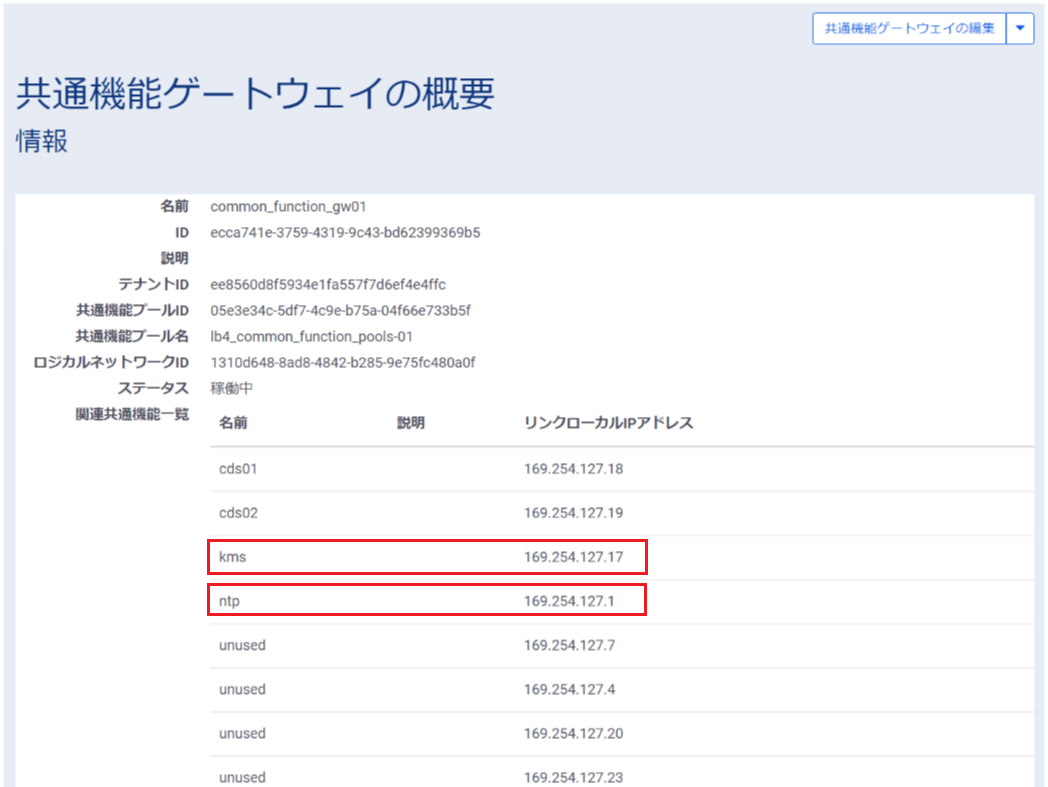 ネットワークインターフェイスの接続が完了したら、NTPサーバーへの疎通確認を実行します。NTPサーバーのアドレスは、共通機能ゲートウェイの詳細から確認できます。