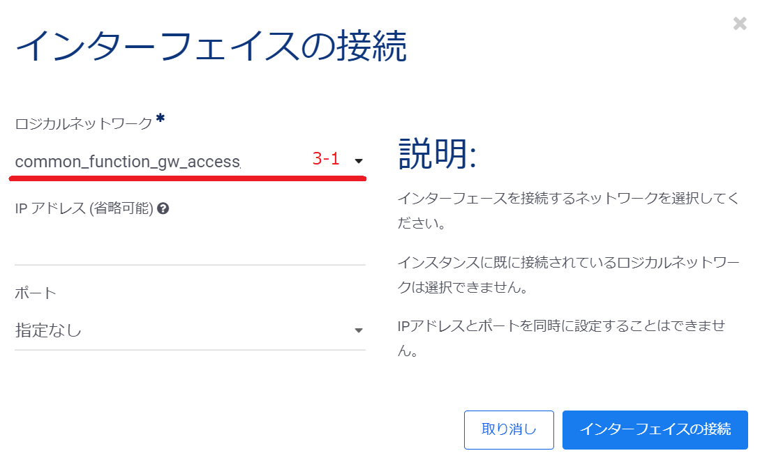 「インタフェースの接続」画面が表示されますので、接続させる「ネットワーク」、IPアドレスを指定します。