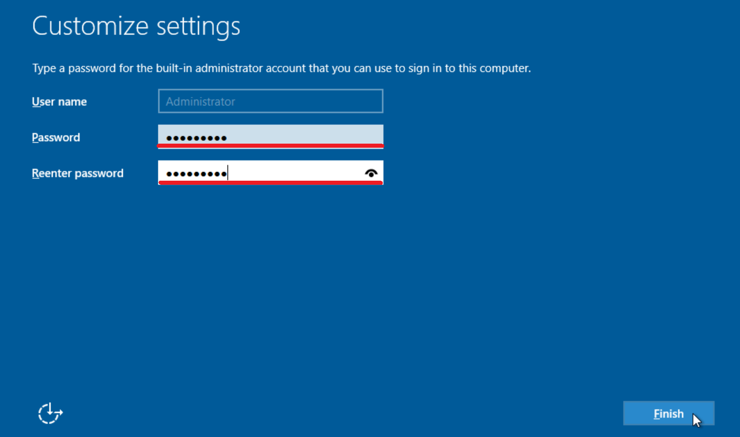 以下のWindowsのセットアップ画面が表示されますので、PWを設定して、『Finish』をクリックします。