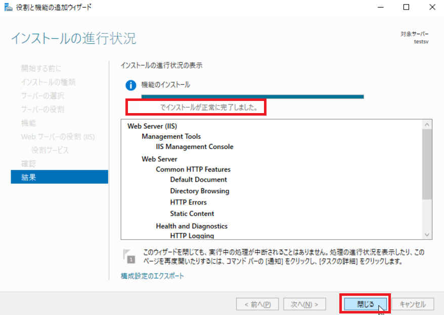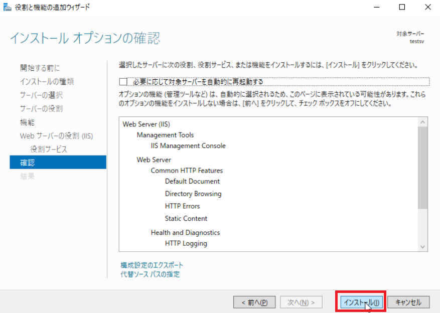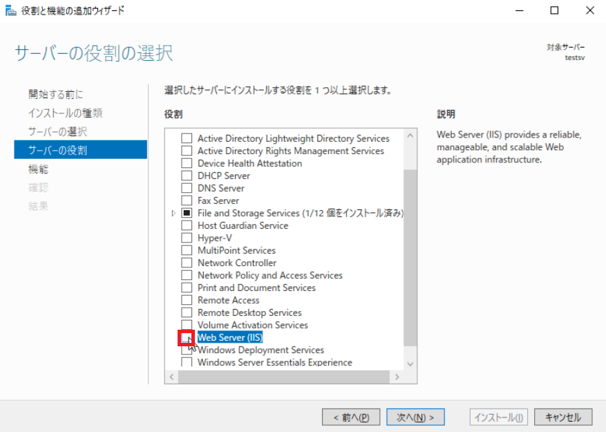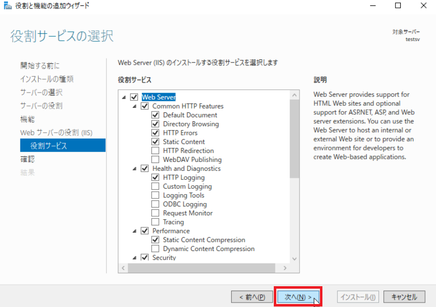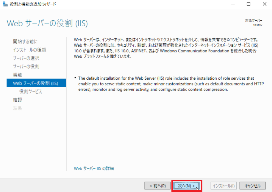 「Web Server(IIS)」にチェックが入っていることを確認し、「次へ」をクリックします。
