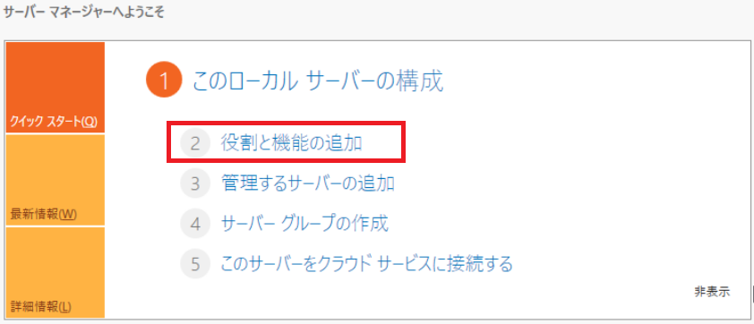 Server Managerの画面から「役割と機能の追加」を選択します。