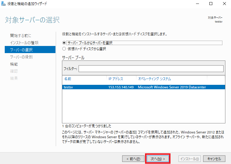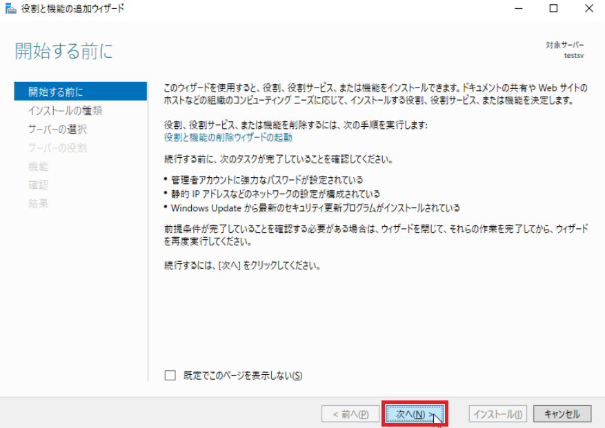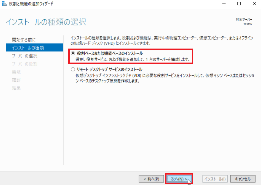 下記の画面が表示されたら、「役割ベースまたは機能ベースのインストール」にチェックが入っていることを確認し、「次へ」をクリックします。