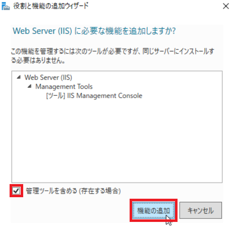 「管理ツールを含める(存在する場合)」にチェックがチェックが入っていることを確認し、「機能の追加」をクリックします。