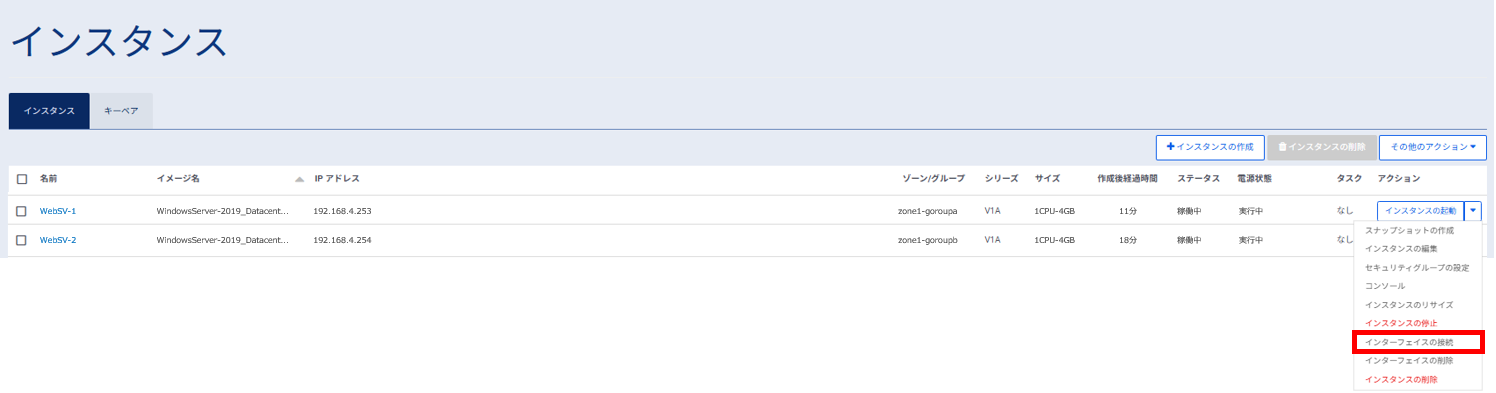 左ペインのメニューから「サーバーインスタンス」→「インスタンス」をクリックし、対象となるサーバーを選択、プルダウンのメニューから「インタフェースの接続」をクリックします。