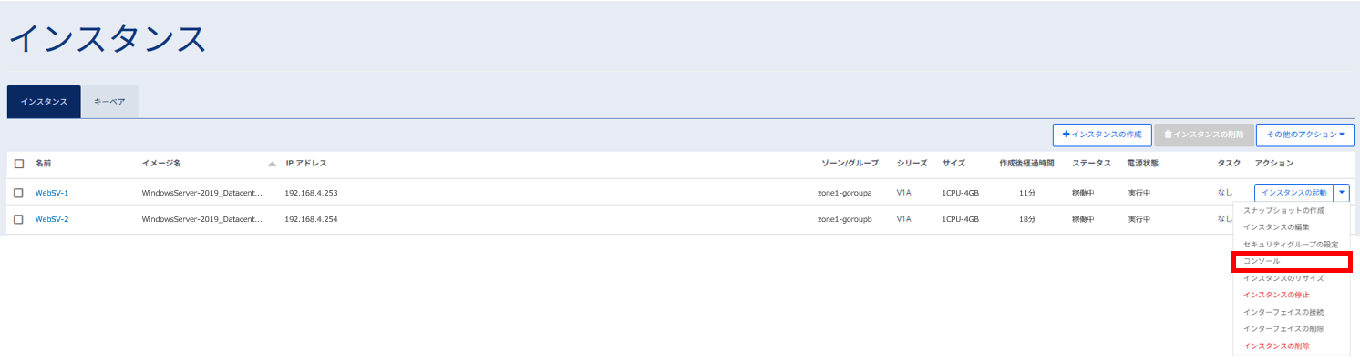 左ペインのメニューから「サーバーインスタンス」→「インスタンス」をクリックし、対象となるサーバーを選択、プルダウンのメニューから「コンソール」を選択します。