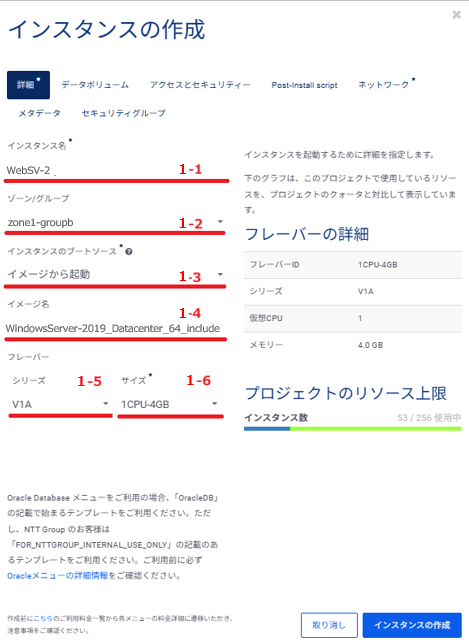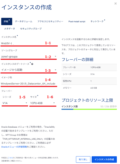 左ペインのメニューから「サーバーインスタンス」→「インスタンス」を選択します。「インスタンスの作成」画面で必要な項目は以下になります。 インスタンス作成にあたっては、下記の6つのタブでそれぞれ初期設定を入力することができます。