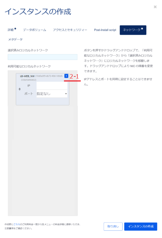 「利用可能なロジカルネットワーク」に表示されているロジカルネットワークの中からこのインスタンスが接続するものを選択し、ドラックアンドドロップで「選択済みロジカルネットワーク」に移動させます。