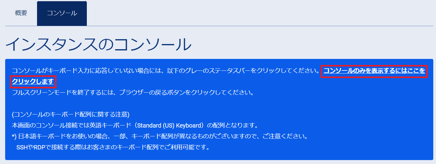 インスタンスコンソール画面から、「コンソールのみを表示するにはここをクリックします」をクリックします。