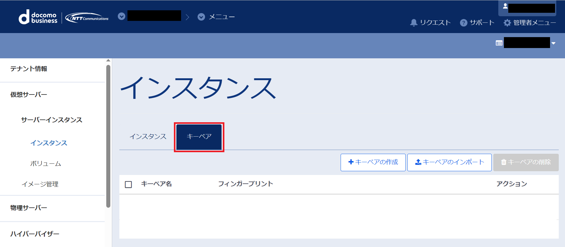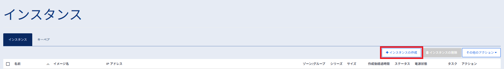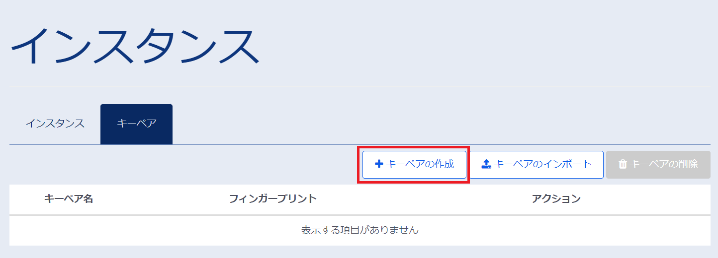 左ペインのメニューから「サーバーインスタンス」→「インスタンス」→「キーペア」を選択します。