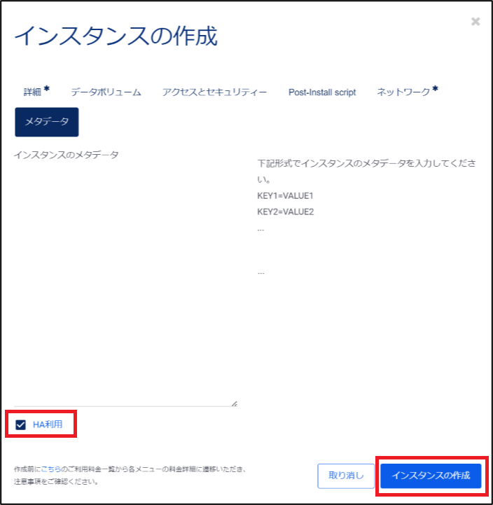 最後に、インスタンスのメタデータを設定します。ここでは作成するインスタンスに対してHA機能の有無を選択することができます。