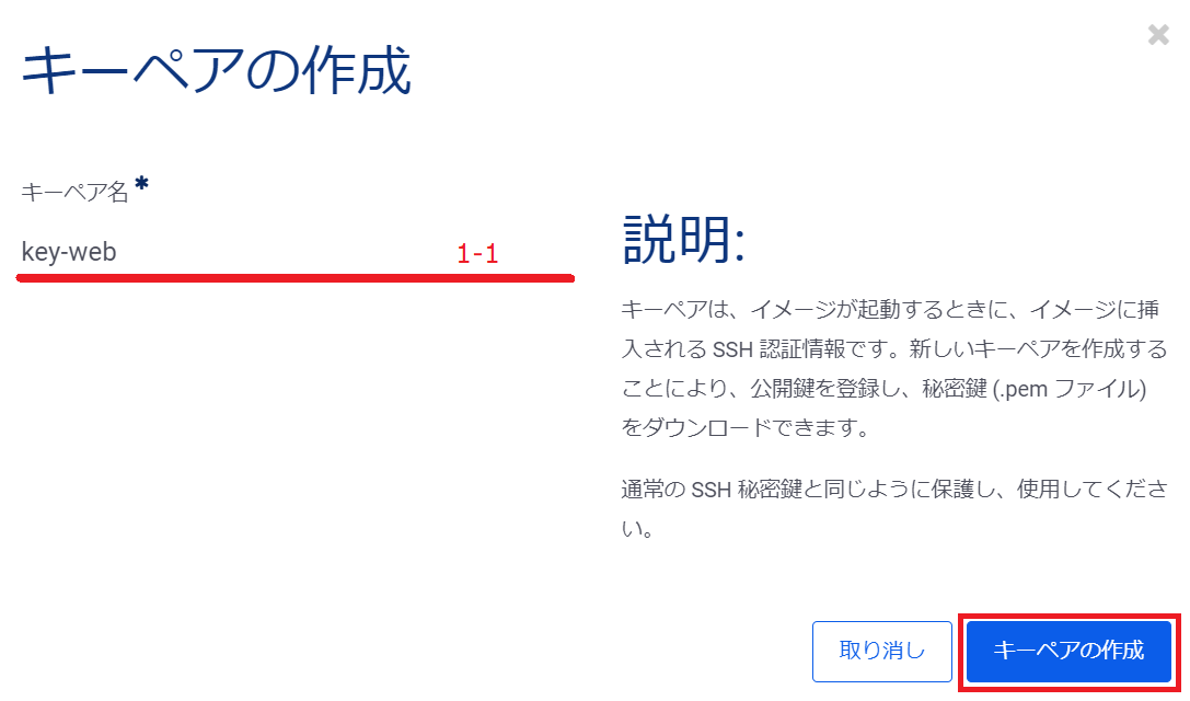 入力が完了したら、右下の「キーペアの作成」をクリックし、キーペアの作成を実行します。