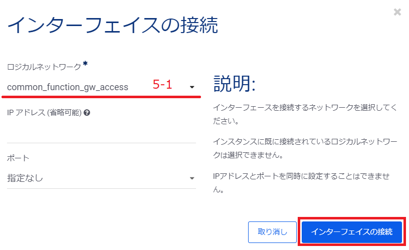 「インタフェースの接続」画面が表示されますので、接続させる「ネットワーク」、IPアドレスを指定します。