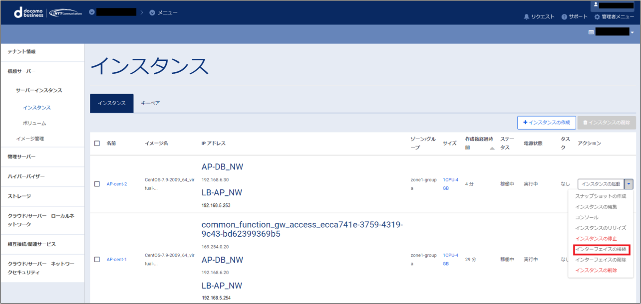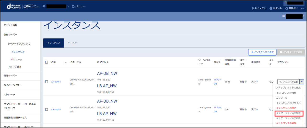 左ペインのメニューから「サーバーインスタンス」→「インスタンス」をクリックし、対象となるサーバー(AP-cent-2)を選択、プルダウンのメニューから「インタフェースの接続」をクリックします。