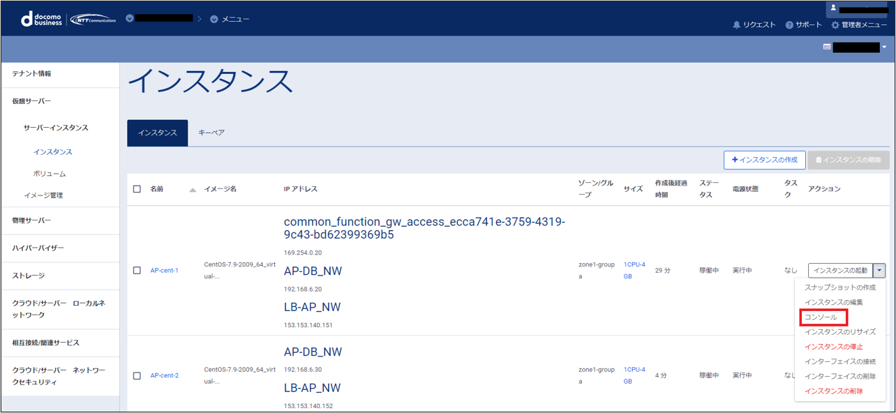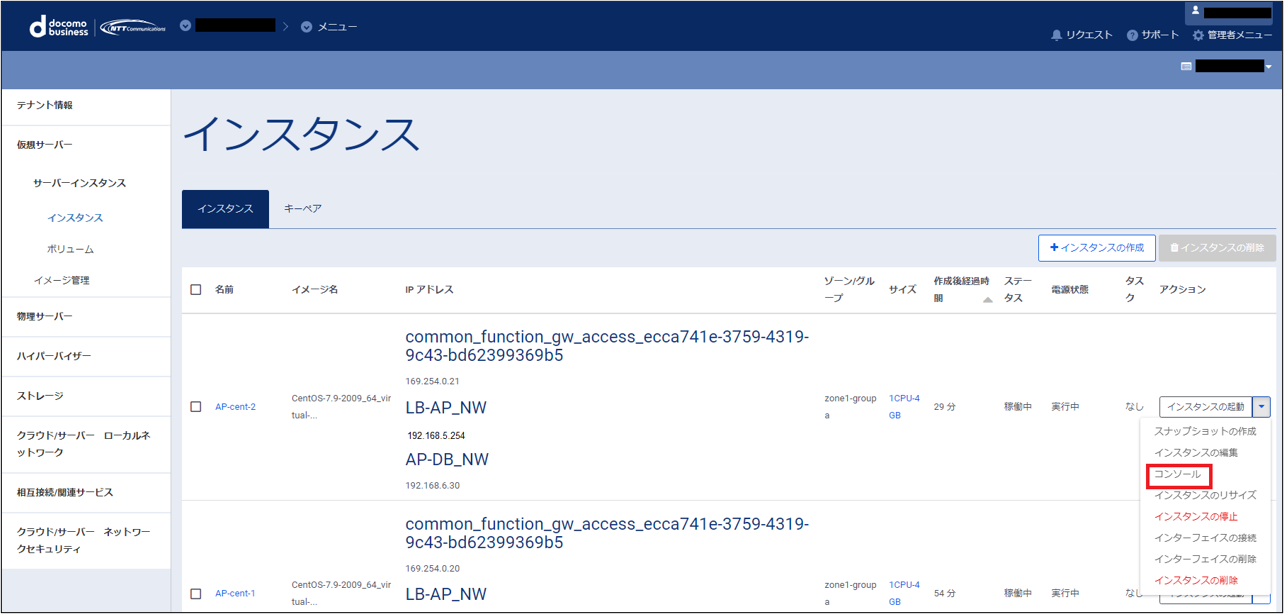 左ペインのメニューから「サーバーインスタンス」→「インスタンス」をクリックし、対象となるサーバー(AP-cent-1)を選択、プルダウンのメニューから「コンソール」をクリックします。